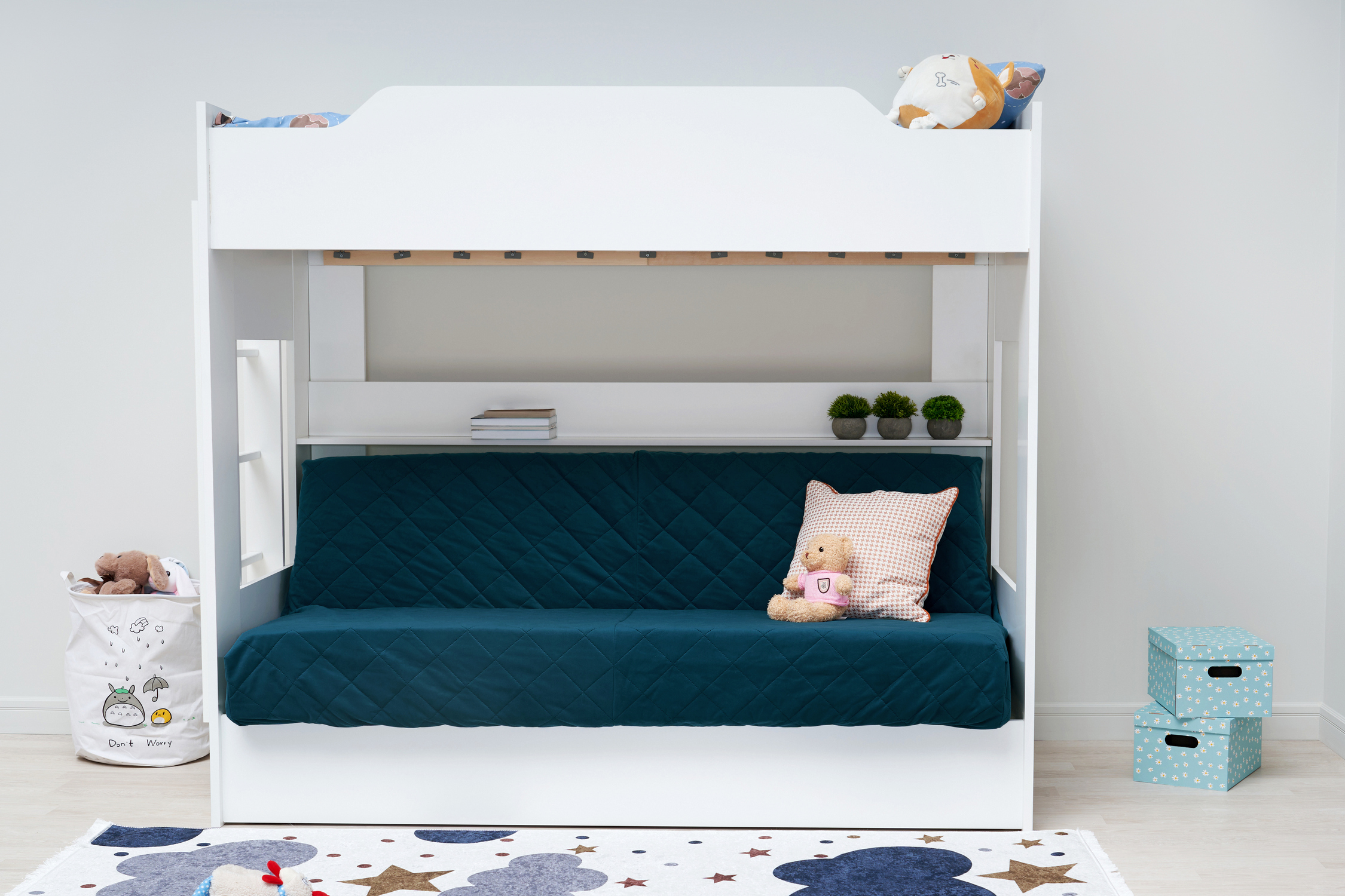 Механизм трансформации дивана: «Книжка». Рекомендуемая высота матраса на верхний ярус 17 см. Максимальная нагрузка на верхний ярус 50 кг. Лестница может быть установлена с обеих сторон кровати. Высота бортика 30 см. Максимальная нагрузка на нижний ярус 90 кг. Чехол съемный.