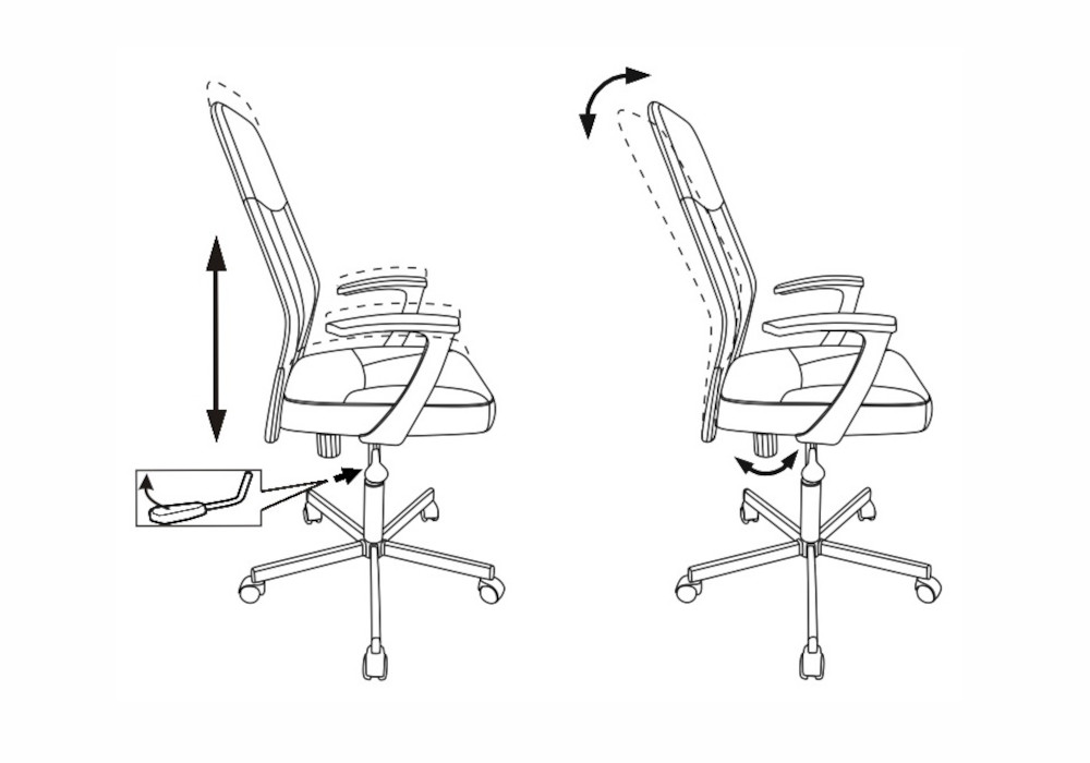 Диаметр колес - 5 см. Высота сиденья - 59 см. Высота с подлокотниками - 78 см. Ширина сиденья - 48.5 см. Глубина сиденья - 42 см. Спинка отдельная от сиденья. Крестовина металлическая.