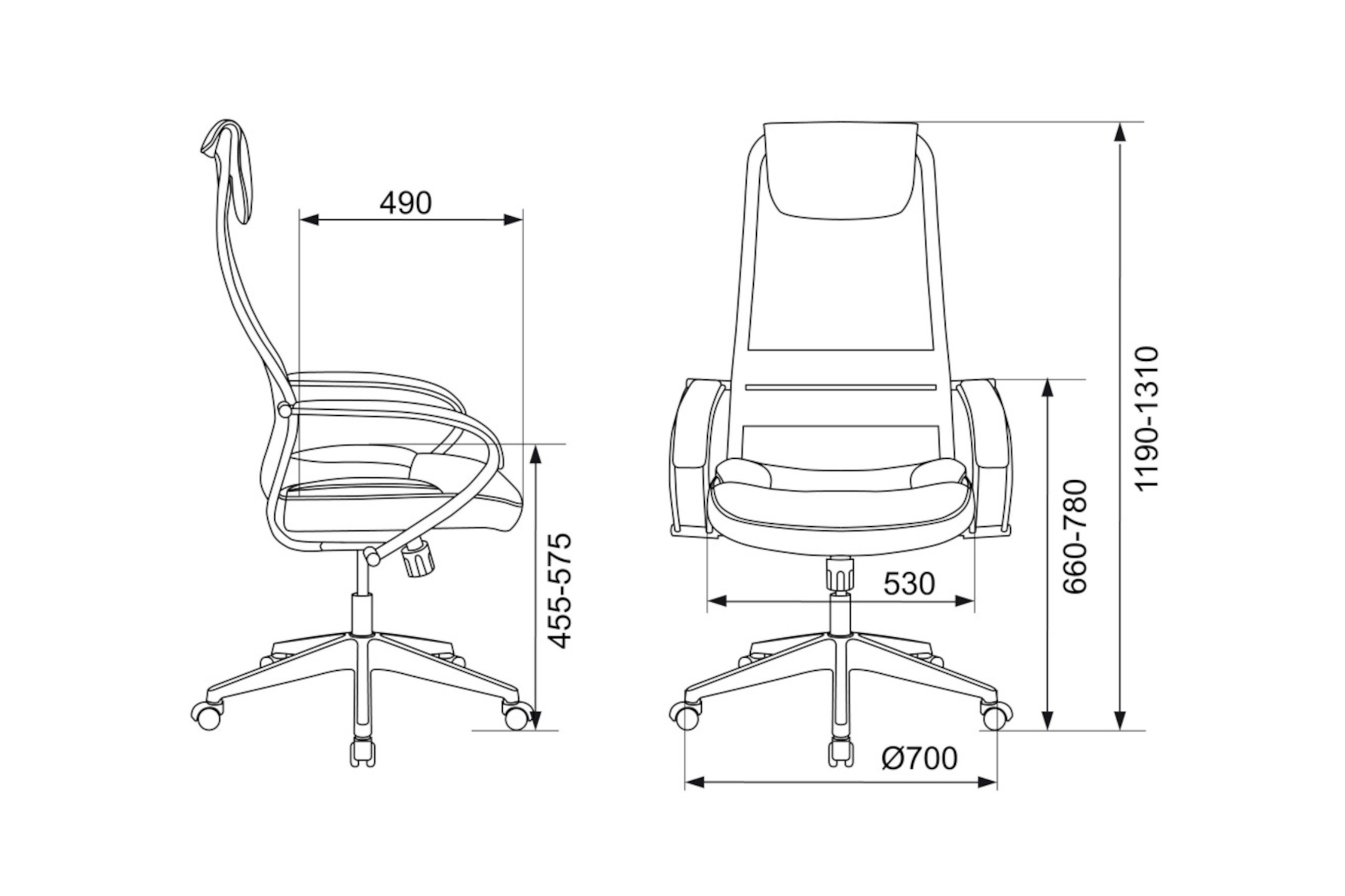 Диаметр колес - 5 см. Высота сиденья - 57.5 см. Высота с подлокотниками - 78 см. Ширина сиденья - 53 см. Глубина сиденья - 49 см. Спинка отдельная от сиденья. Крестовина пластиковая. Материал колес с накладкой PU. Подлокотники металлические с накладками из искусственной кожи. Механизм качания с регулировкой под вес и фиксацией в вертикальном положении.